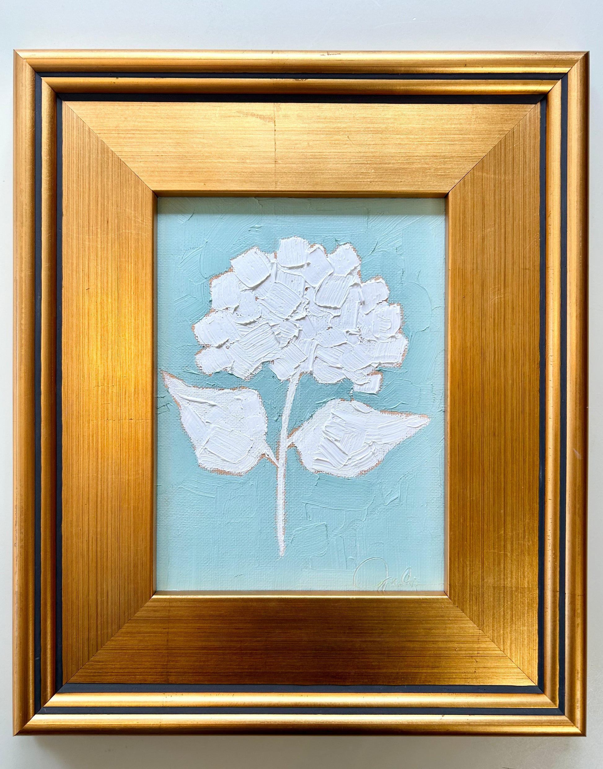 Smaller paintings are typically framed with a Plein Air gold frame or a gold floater frame, depending on the size and shape of the canvas (frames are pictured and mentioned in the painting description).