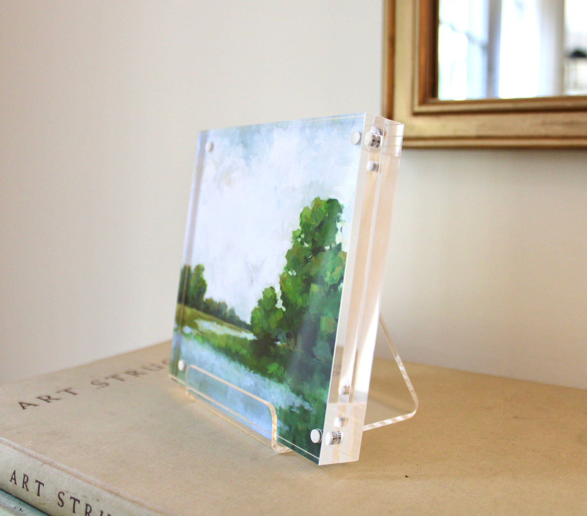 Perfect to dress up a coffee table, bookshelf, dresser, or console, this acrylic framed print features Julia's original oil painting, "For This Time".