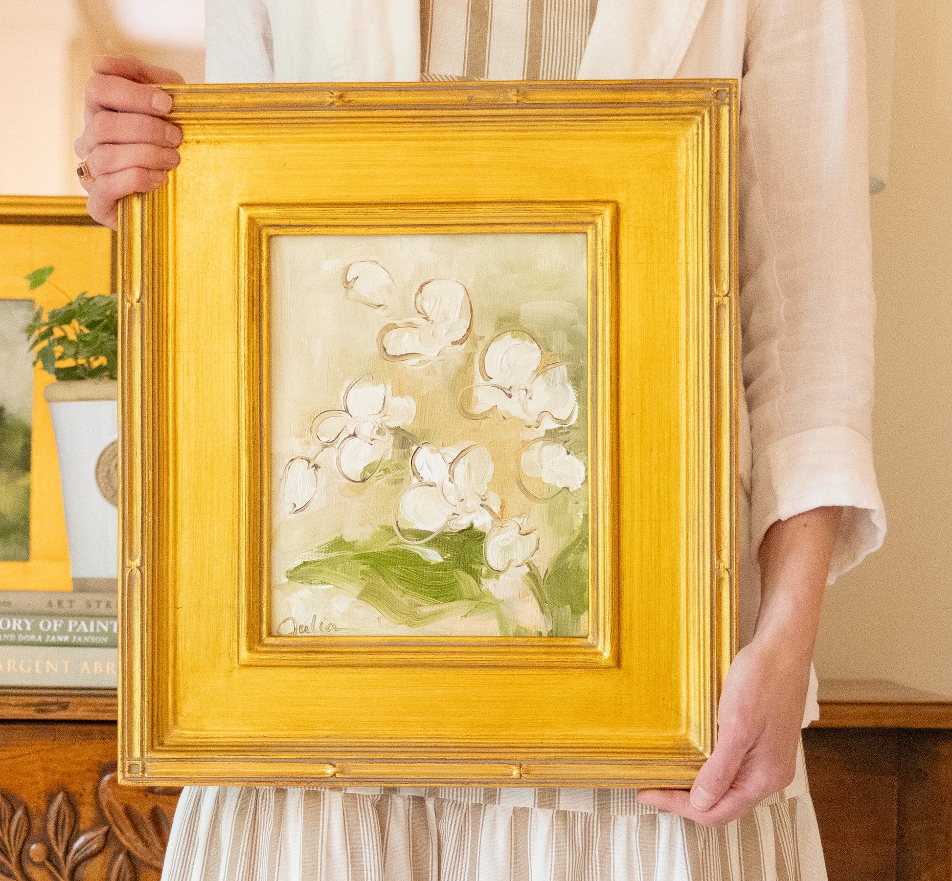 Smaller works are typically framed with a Plein Air gold frame or a gold floater frame, depending on the size and shape of the canvas (frames are pictured and mentioned in the painting description).