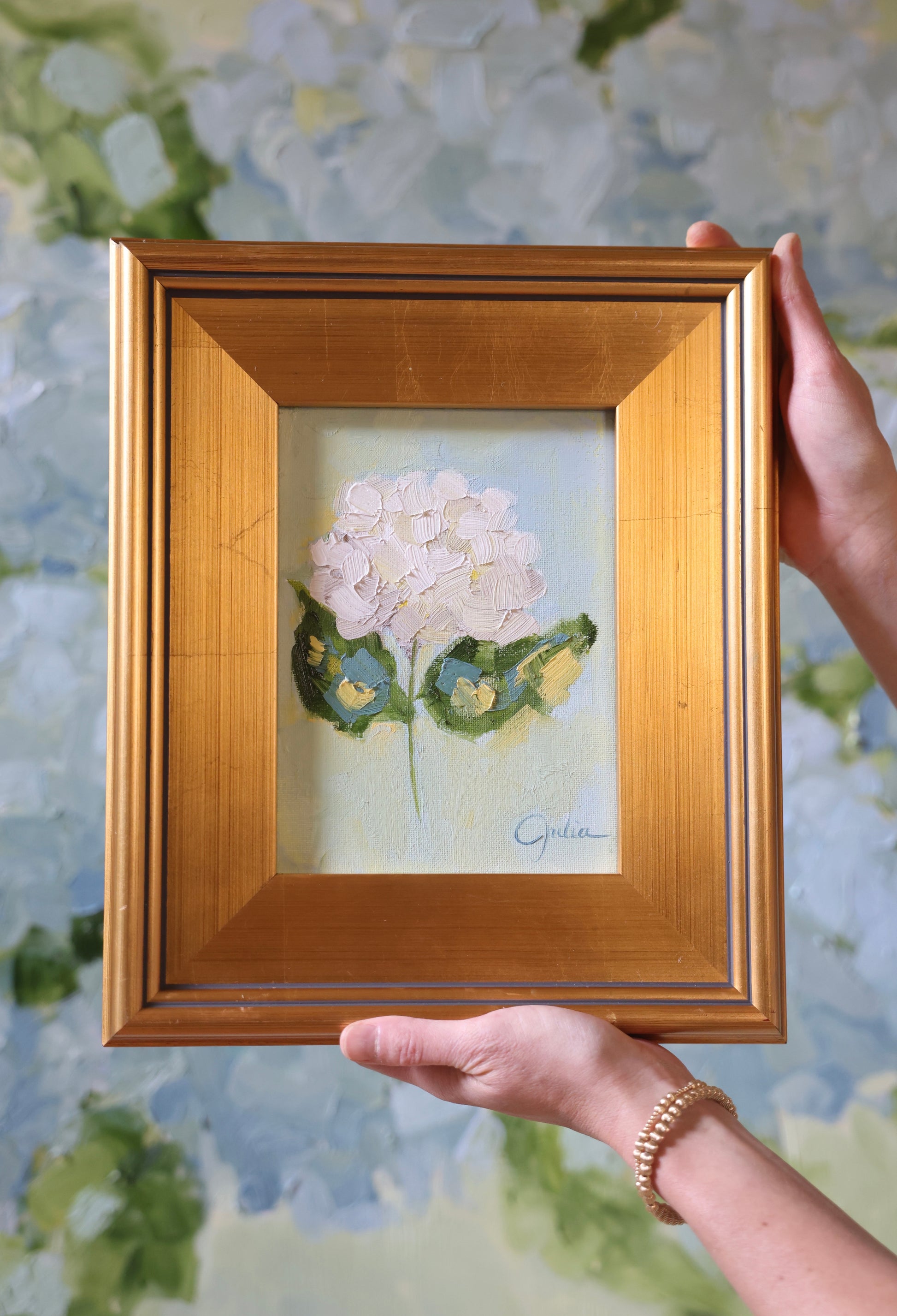 Smaller works are typically framed with a Plein Air gold frame or a gold floater frame, depending on the size and shape of the canvas (frames are pictured and mentioned in the painting description).