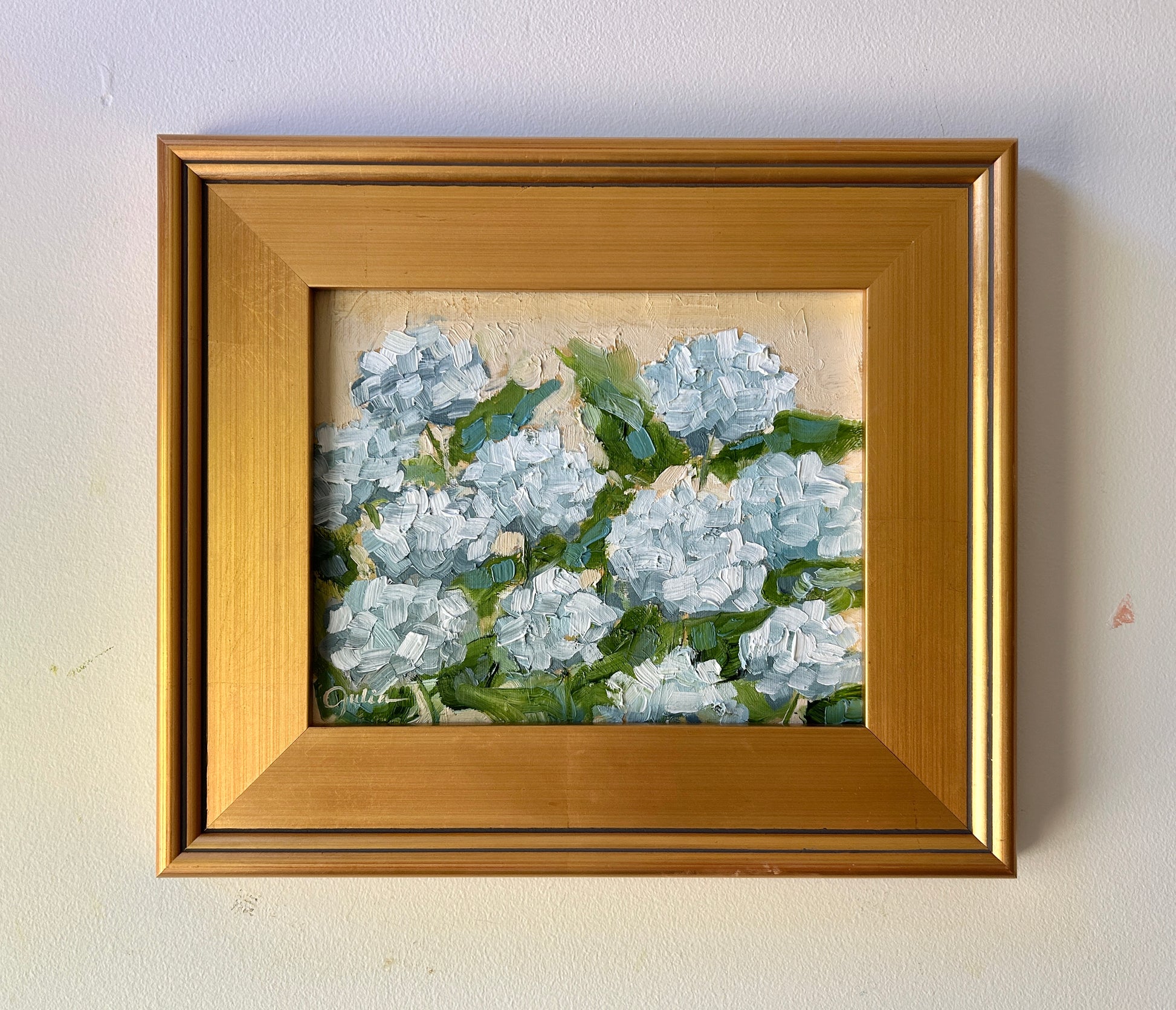 Smaller works are typically framed with a Plein Air gold frame or a gold floater frame, depending on the size and shape of the canvas (frames are pictured and mentioned in the painting description).