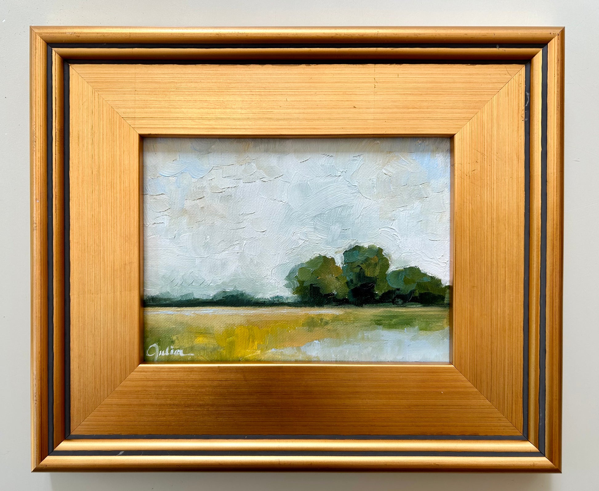 Smaller works are typically framed with a Plein Air gold frame or a gold floater frame, depending on the size and shape of the canvas (frames are pictured and mentioned in the painting description).