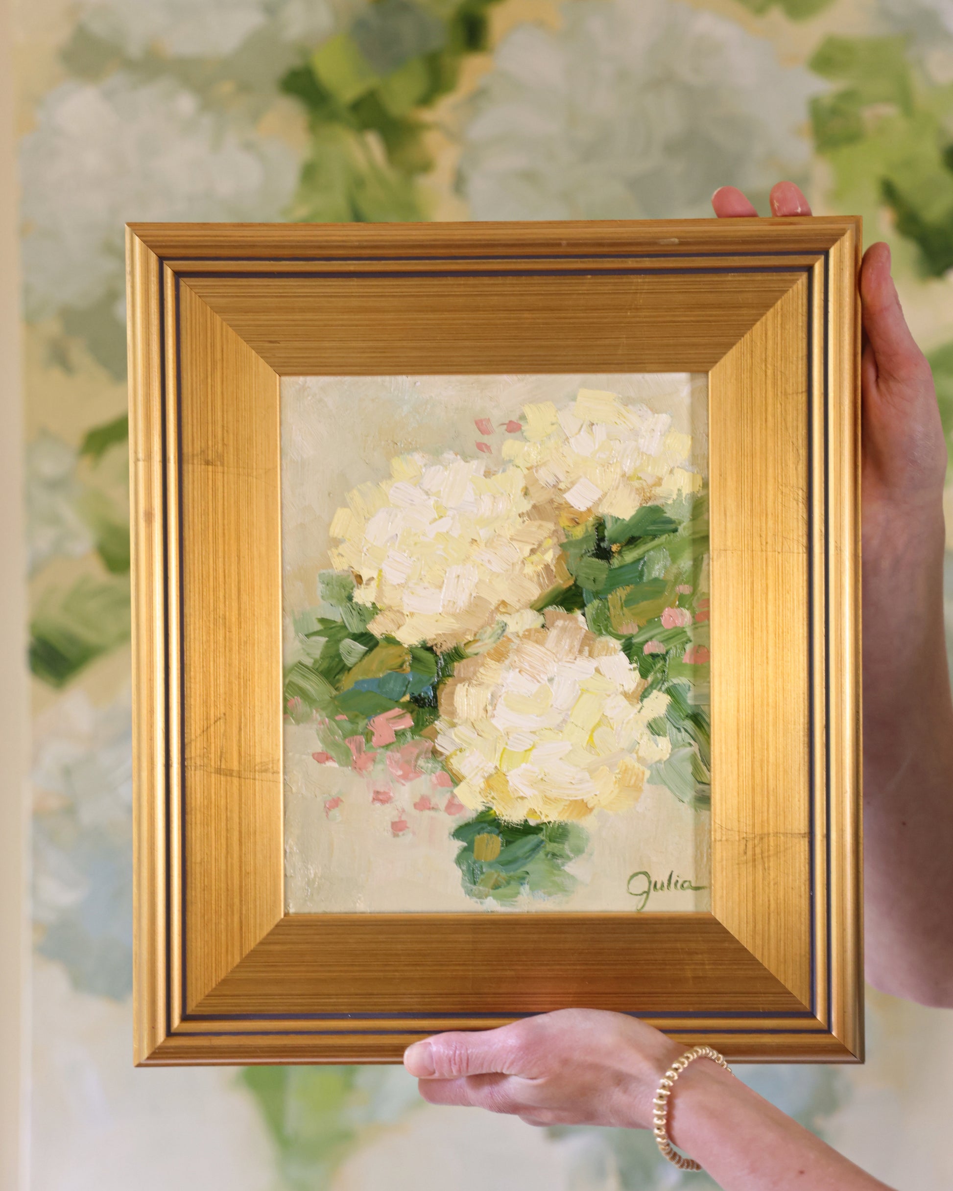 Julia has a local (Charlotte, NC) framer that she uses for her pieces, and will be happy to work with you to select the best frame for your painting. The lead time is approximately 4-6 weeks. She also offers virtual consultations if you would like to work with your own framer.