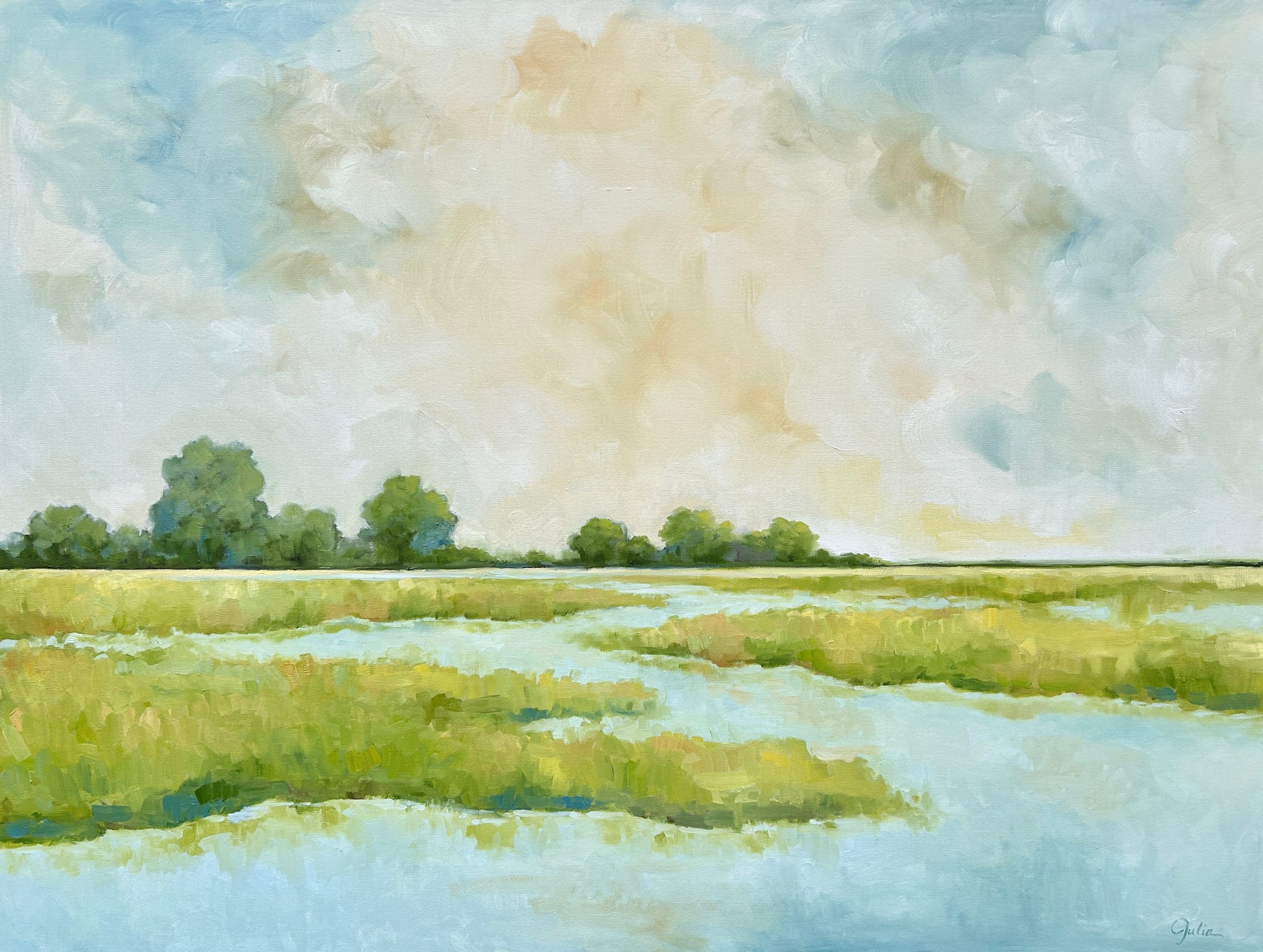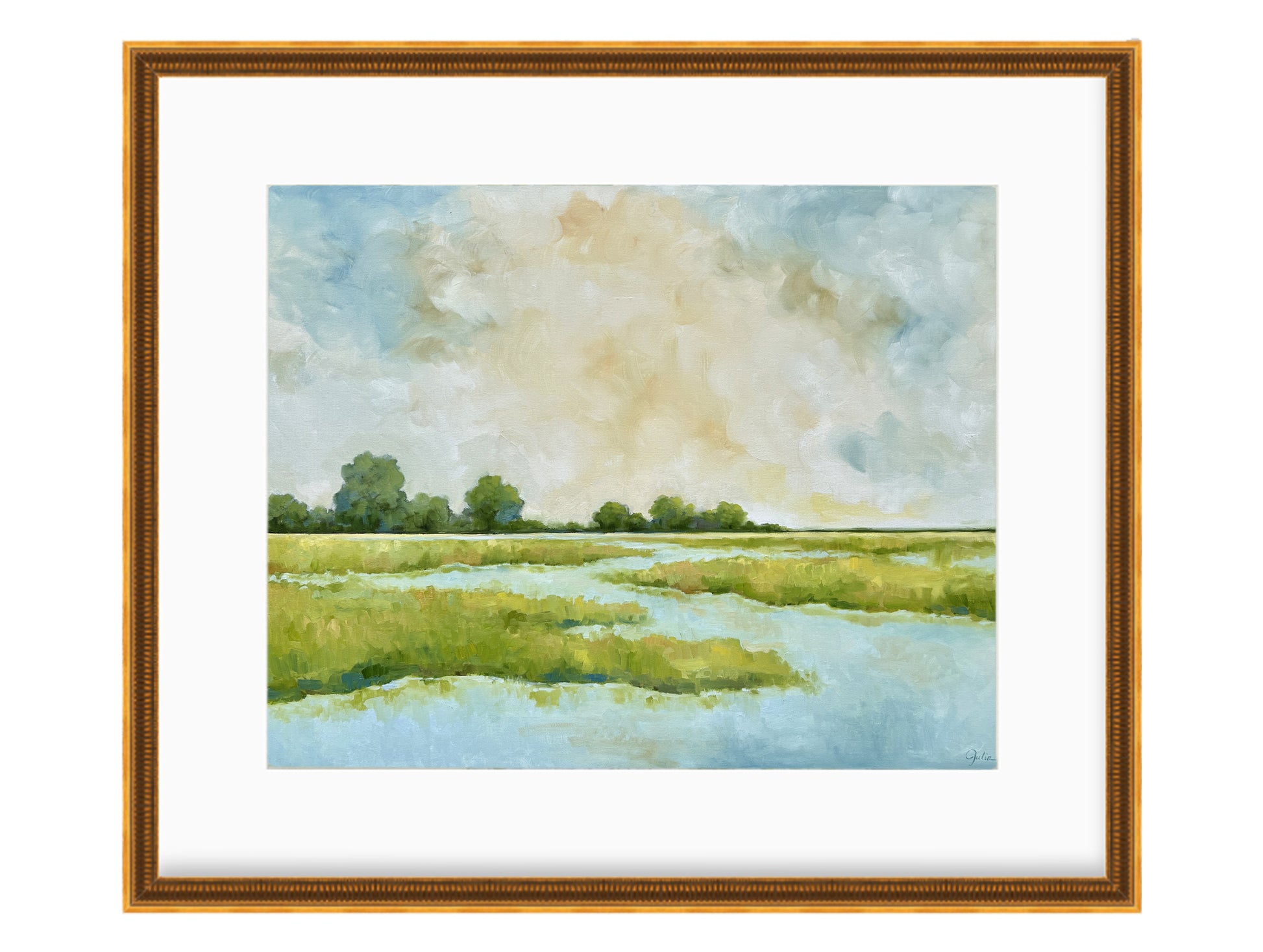 Julia has a local (Charlotte, NC) framer that she uses for her pieces, and will be happy to work with you to select the best frame for your painting. The lead time is approximately 4-6 weeks. She also offers virtual consultations if you would like to work with your own framer.