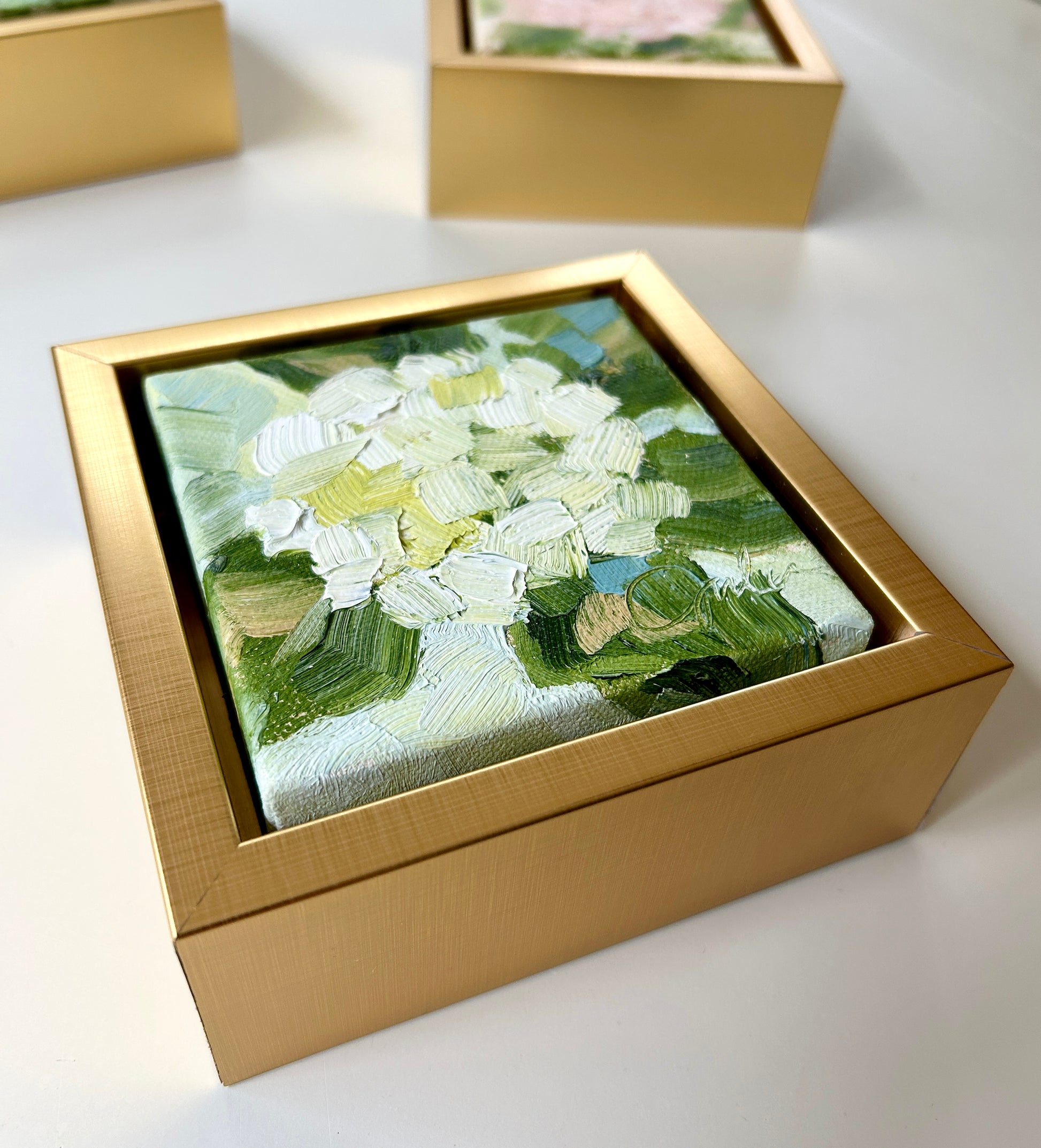 Smaller works are typically framed with a Plein Air gold frame or a gold floater frame, depending on the size and shape of the canvas (frames are pictured and mentioned in the painting description).